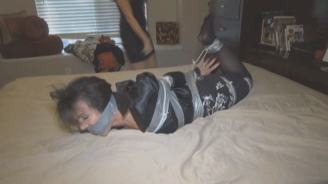Long legged blonde Vicky Vixxx has me all taped up, zip tied and tape gagged on the bed while she waits for the ransom payment. I struggle helplessly sobbing into my gag when Vicky appears to torment me. She pulls my tits out of my blouse and dangles nipple clamps in front of my terrified eyes. She applies them to my nipples then threatens to roll me onto my belly and the femdom pulls on the chain twisting it. She laughs at my agony then exits the room to wait ... I am taped and zip tied so tightly I can barely roll over. My elbows are welded together with the tape and zip ties causing my hands to go numb. The tape gag is massive and my screams are muffled so that no one will hear me crying out for help. I remain helpless and alone for what seems like an eternity and finally my captor returns. She informs me that I will soon be taken away in the trunk and laughs saying make yourself comfortable while you wait for your ride ...