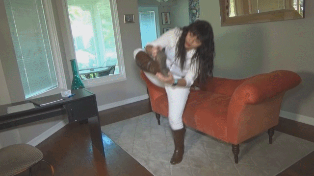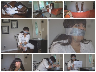 Young Hawaiian brunette Vanessa Luxx shows up for work in her new white outfit. She struts in showing off flaunting her tight white jeans and brown boots. You watch as she poses and brags about her expensive boots hopping on one leg showing you the soles of her boots when unexpectedly she falls backwards over the couch and just her boots stick up in the air. Curvy Vanessa manages to get out from underneath the couch. She wants to know your secret even though she admits to being a complete blabber mouth. Suddenly she finds herself tape gagged with duct tape wrapped around her pretty face and her hands taped up. Vanessa struggles helplessly infuriated that you've done this to shut her up and now your force her to own up to it ...