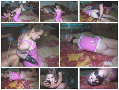 Swiss model Diamondly arrives to shoot exuding a cocky attitude and immediately her arrogance is apparent. She insults me and brags on and on about how she is the best bondage model in Europe. She confidently asserts that she is so flexible and able to escape from any bondage ... She doesn't hesitate to add that my bondage looks especially easy to get out of since I'm so old and incompetent. I make a deal with her that I'll agree to her ridiculously high rate if she can escape this one tie. Diamondly laughs at me and readily agrees. I tie her elbows together making sure to cinch them extremely tightly then add a restrictive chest harness. Diamondly continues bragging and bends her arms up making sure I'm aware of her flexibility. This time it is me laughing as I wrap layer upon layer of electrical tape around her forearms, hands and fingers ensuring she won't be escaping any time soon without the use of her fingers. I bind her ankles then peel off her panties adding a pussy splitting crotch rope to her bondage finishing it off in a nice back arching hogtie. The 19 year old bimbo is still insulting me as I add the final knot. I'm getting really tired of her big mouth so I grab her panties and stuff them into her mouth wrapping her pretty face first with lots of layers of vet wrap before I add the last layer of thick black electrical tape giving her a brutal mouth distorting cleave gag. You've got ten minutes to escape dear ... let's see if you can! I leave the young teen helplessly bound, gagged and frustrated ...