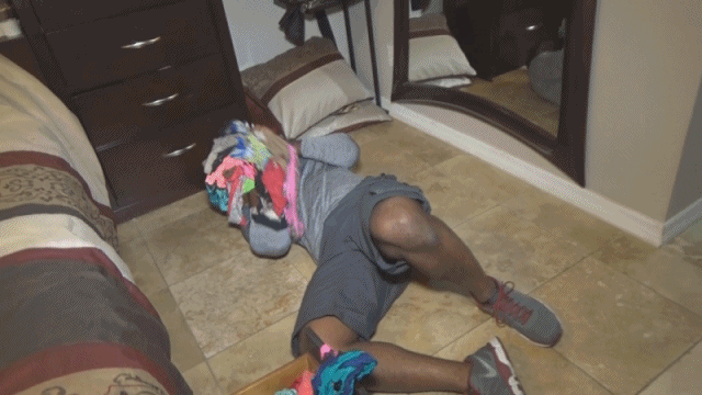 Nyxon and I were looking to get in shape for the new year so we hired a personal trainer from Craig's List. Muscular black guy Jah shows up and we negotiate a great deal to begin personal training. He asks to use the bathroom before we begin. After a few long minutes I look to Nyxon - this is taking far too long. What the hell is he going in there. We enter the room to find the muscular ebony man with his hands full of my panties sniffing them and rubbing them on his face! We threaten to let his dirty little secret out and I cover his head with panties. I shove a pair into his mouth then grab some thick electrical tape and wrap his face with layers and layers until he's reduced to grunts and groans. I cross his legs like a girl and bind his ankles and knees with the tape as Nyxon grabs pantyhose and pulls it over his face hooding him. We add several colorful panties on his face and demand free training to keep his secret. Poor helpless Jah struggles in the bondage and I keep adding more and more tape until he is unable to get away. He struggles and groans but I'm not done with him yet. I tape up his hands into little balls and grab his cock taunting him. We leave him helplessly bound rolling around the floor next to a large pile of panties.