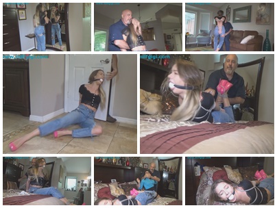 Beautiful 19 year old Naomi Swann is getting ready to go out for the night. She's checking herself out in the mirror admiring how great she looks in her tight jeans, high heels and cute little crop top. She is putting the finishing touches on her makeup when she hears a voice outside. She goes to the front door opening it when she is ambushed by a big bald thug. He pins her between his legs and XXXX a big ballgag into her mouth. Naomi struggles but she is no match for his size and strength and he quickly binds her elbows and wrists tightly together behind her back. He stands her up to admire his handiwork and Naomi knees him in the balls doubling him over. She seizes the opportunity to run into her room and sits against the door trying desperately to prevent him from entering. It doesn't take long for the bastard to get in the room. He tosses her onto the bed and drops and big pile of rope next to her. First he ties her ankles tightly together then adds rope above and below her small breasts. Poor helpless Naomi sobs into her gag as he continues to add more rope to her petite young body. He finishes her off in a super tight hogtie and leaves her sobbing and struggling on the bed. I come home and here Naomi's muffled cries for help. I rush into the room and find her brutally bound. I reach over to untie the knots when suddenly I feel a big beefy hand cover my mouth. I kick and fight as I am dragged away by the thug ..