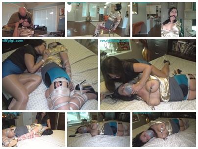 Secretary Nadia White took a bribe from a competitor so she copied the company's secret invention while she believed I was out of the office. She wasn't aware that I was behind her listening to her conversation and copying the data onto a flash drive. I force the busty blonde bimbo onto the couch and bind her arms together behind her back cinching the elbows nice and tight. Then I tie her ankles together before forcing a panty into her big mouth and wrapping many layers of bandage around her pretty face. Nadia's big blue eyes widen in fear as she realizes she is in big trouble when I inform her that it will appear that she ripped off the client who bribed her. I walk away to delete the contents of the flash drive. Nadia manages to maneuver herself onto the floor and struggles desperately to get away flailing her bound arms helplessly. I return pushing the big tit secretary onto her side and rip open her turtleneck sweater exposing her big tits. I add more rope to her ripe body making sure to split her pussy in two with a brutal crotch rope. I secure her wrists to the crotch rope so that every movement of her hands causes friction on her cunt. I leave the pretty thief bound, gagged and helpless ..